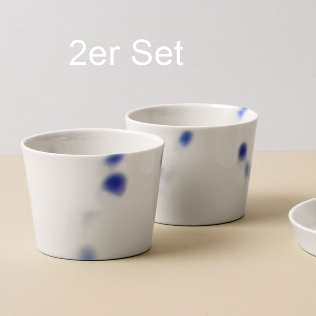 2er Set Becher aus feinem handgefertigtem Porzellan mit kobaltblauen Tupfen.