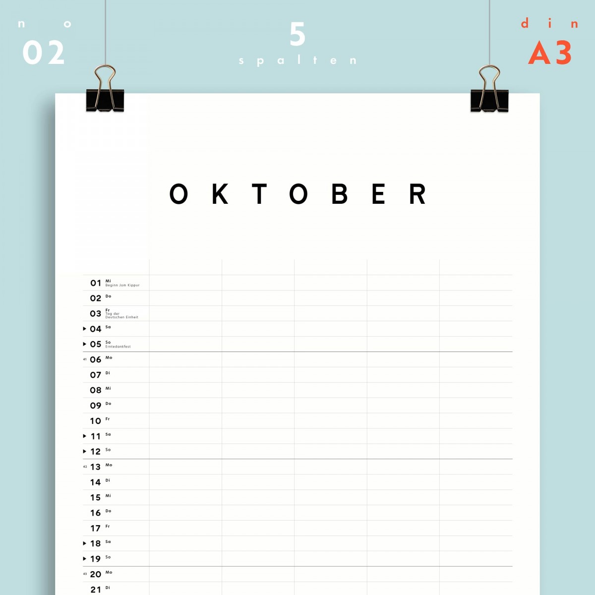 Im Kalender findest du alle wichtigen Feiertage Deutschlands sowie weitere wichtige (Feier)Tage, wie Ramadan, Jom Kippur u.ä. sowie die Kalenderwochen.