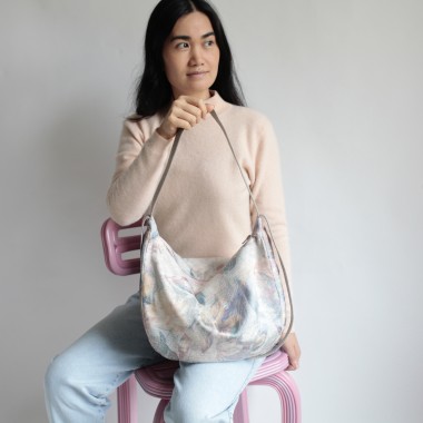 Upcycling Beuteltasche aus samtartigen Vorhangstoff mit rosa Reißverschluss und zwei unterschiedlich langen Trägern. Stabil genäht mit Baumwollinnenfutter in Grau. Waschbar bei 30 Grad Feinwäsche.