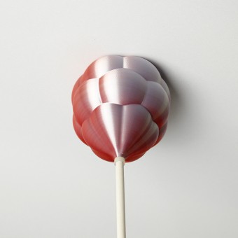 Der hier zum Teil in die Decke geschobene Körper, ist ein Ikosaeder der zu den fünf platonischen Körpern zählt. Er ist ein Polyeder, also ein Vielflächner und besteht aus 20 Flächen, die aus gleichschenkligen Dreiecken bestehen. In Fünfer Gruppen entstehen regelmäßige Fünfecke. Durch das Eintauchen des Ikosaeders in die Decke sind noch 15 der Dreiecksflächen zu sehen. Der Ikosaeder besticht durch sein Facettenreichtum, der von jeder Seite aus schön zu betrachten ist. Durch ihre unterschiedlichen Winkel schattieren sich die Flächen verschieden und sorgen für eine spannende geometrische Plastizität bei wechselnden Lichtsituationen.