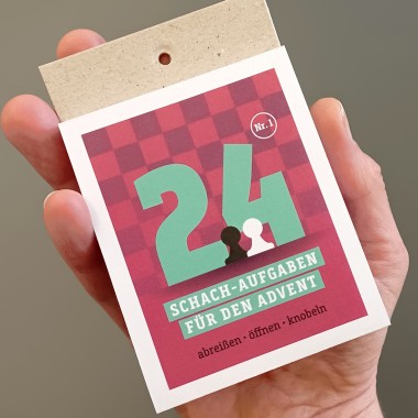 Die Blätter dieses kleinen Adventskalenders sind an der Oberseite geleimt, wie bei einem Notizblock. Ab dem 1. Dezember heißt es nun jeden Tag: abreißen – öffnen – losknobeln! Auf 24 Doppelseiten gibt es verschiedene Schachaufgaben, je nach Schweregrad 'matt in 1 und 2 Zügen' oder 'matt in 2 und 3 Zügen'. Die Auflösungen erfährt man am Folgetag.