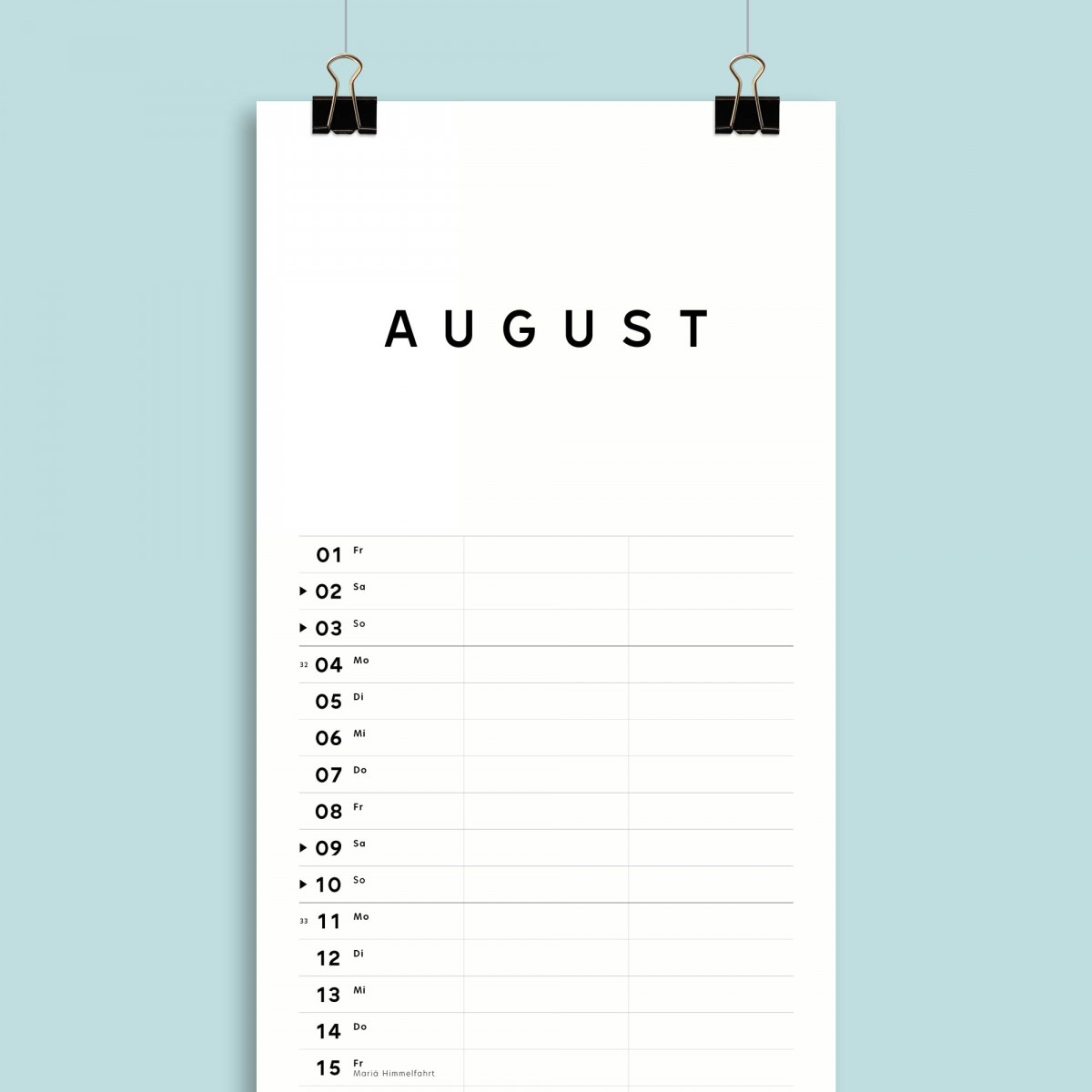 Mit diesem Kalender kommst du gut organisiert durch das nächste Jahr. Das schmale aber lange Format (14,8 x 42 cm) passt an jede Wand und bietet genug Platz für Geburtstage und wichtige Termine.