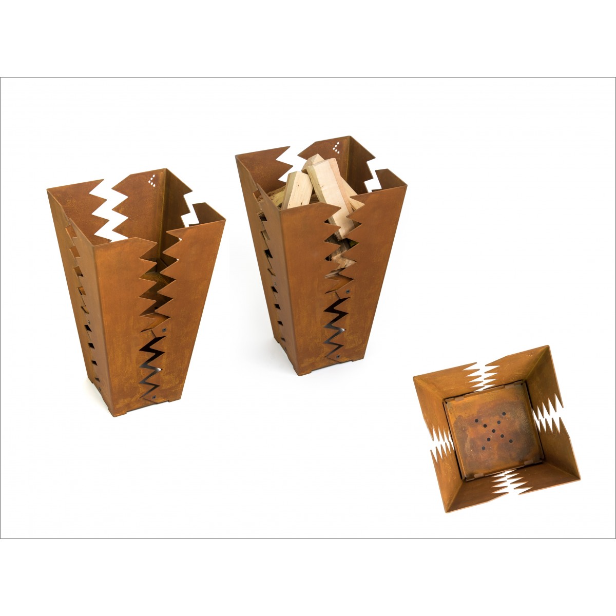 Beim Abbrennen eines Lagerfeuers entsteht Ruß und Asche. Wird am offenen Feuer gegrillt, wird die Feuerstelle mit Fett bespritzt. Dies ist unvermeidbar. Der Anspruch, eine Feuerstelle nach Gebrauch zu reinigen, widerspricht dem ursprünglichen Umgang mit dem Feuer. Aus diesem Grund verwenden wir wetterfestes Stahlblech das im Lauf der Zeit oxidiert, was dem Erscheinungsbild der Feuerstelle Charakter und Persönlichkeit verleiht.
