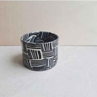 Ich habe diesen Becher aus weißem Ton von Hand gefertigt und im Keramikofen gebrannt. Anschließend erhielt er eine transparente Glasur und wurde ein zweites Mal bei 1230 °C gebrannt.