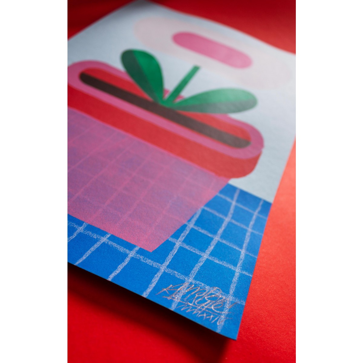Fünffarbiger Druck im Schablonendruck per Hand auf hellblauem Fotokarton (21x29,7cm, 300g/qm). Einzeln mit Farbstift indiviudualisiert. Limitiert, einzeln signiert und durchnummeriert. Der Kunstdruck wird nicht gerollt, wegen der schweren Grammatur, sondern in einem Versandkarton plan verschickt.