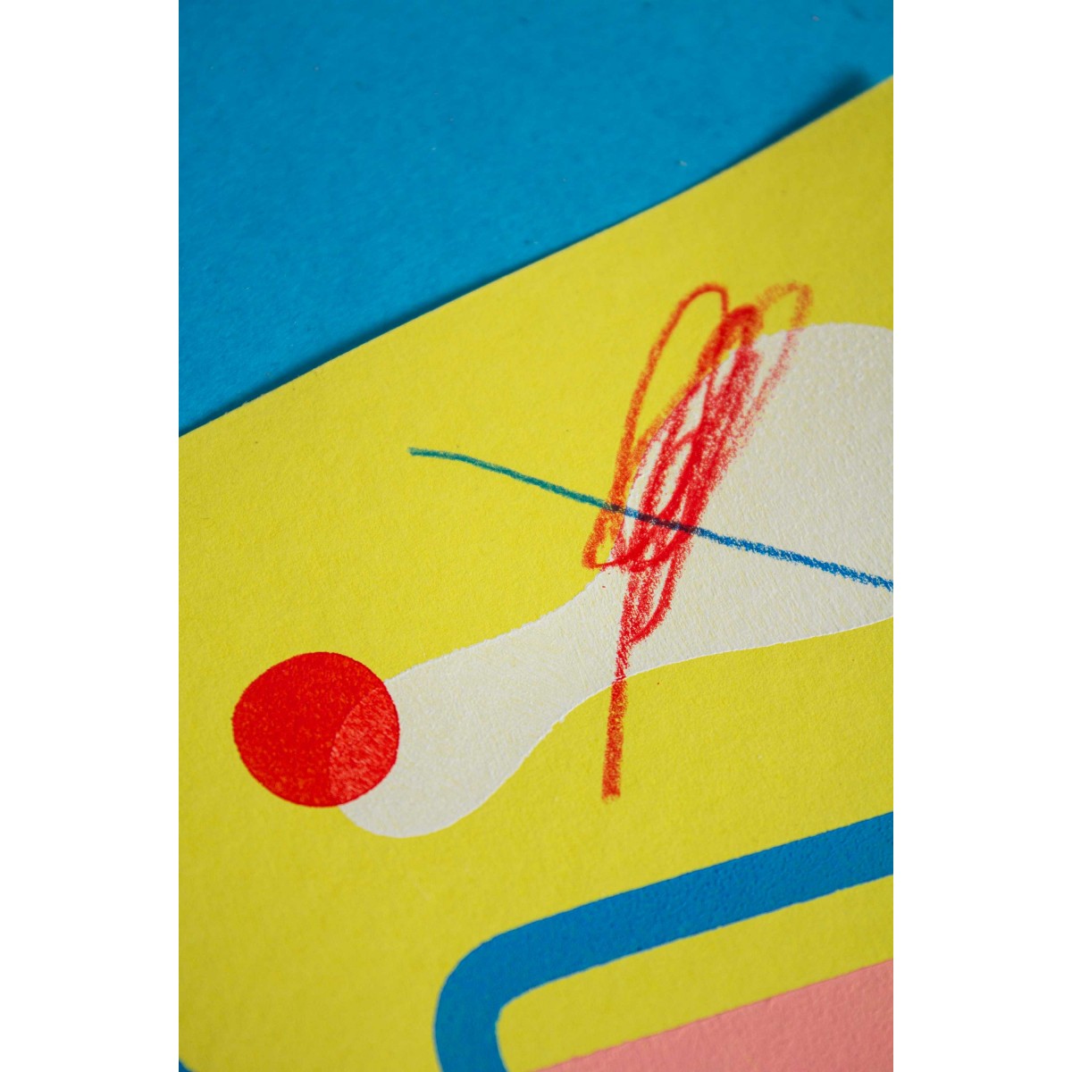 Fünffarbiger Druck im Schablonendruck per Hand auf gelbem Fotokarton (21×29,7cm, 300g/qm) gedruckt. Versehen mit individuellen Farbstiftlinien. Limitiert, einzeln signiert und durchnummeriert. Der Kunstdruck wird nicht gerollt, wegen der schweren Grammatur, sondern in einem Versandkarton plan verschickt.