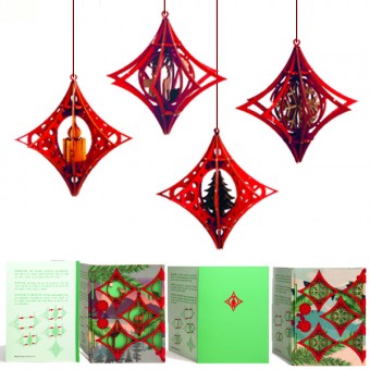 Die Papiere sind aus feinstem italienischem Papier hergestellt. In jede Karte wird ein aufwendiges Muster gelasert, dass dann durch ein eigens angefertigtes Werkzeug in eine 3 dimensionale Reliefform gebracht wird. Der Neoneinleger hinter der Reliefstruktur verstärkt durch den Farbkontrast den Effekt. Der weiße Papiereinleger kann beschrieben werden. Wenn alle Papiereinleger entfernt werden, kann die Karte als Teelicht genutzt werden.
