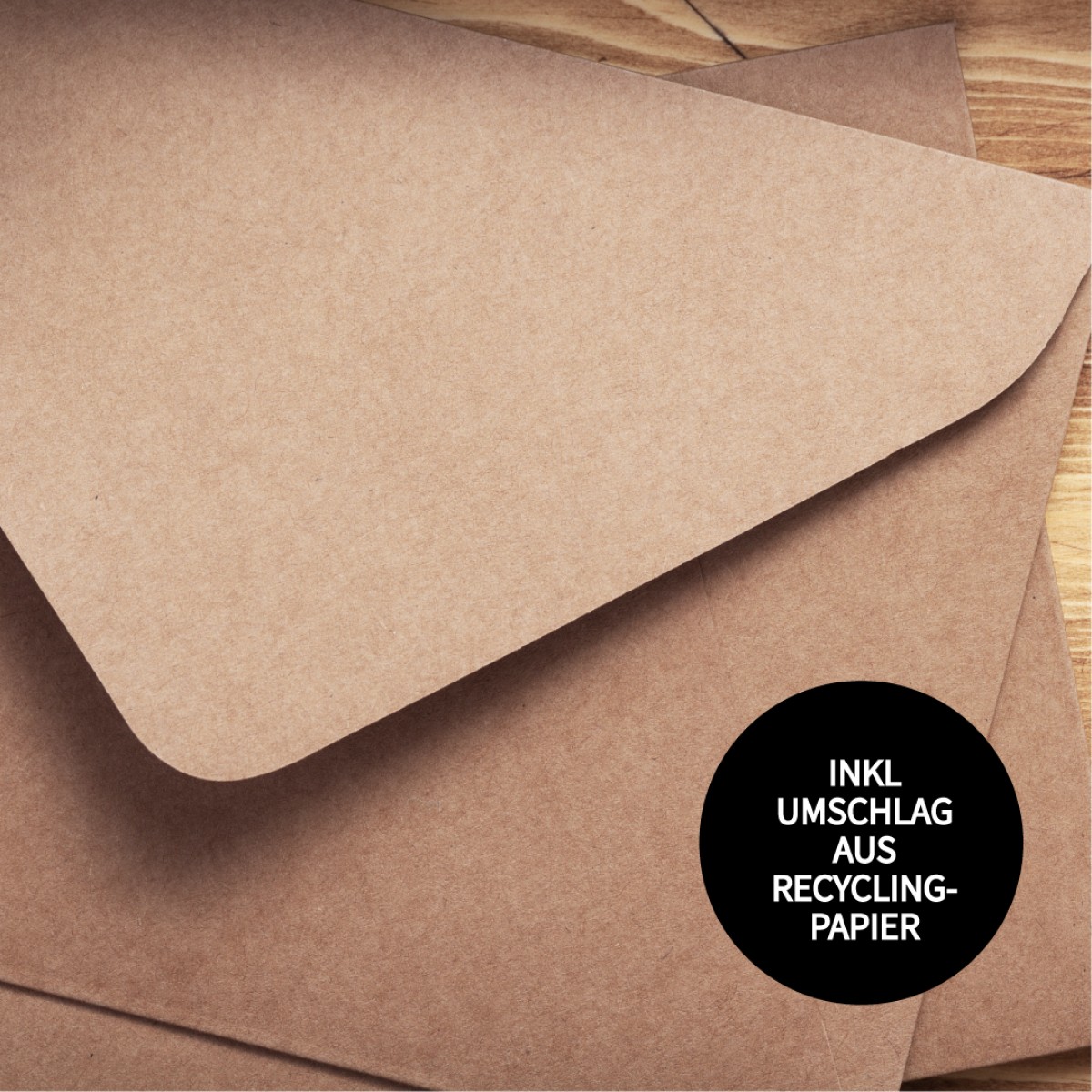 Du erhältst die Klappkarte inklusive eines Briefumschlags aus Recycling-Kraftpapier. Auch unsere Versandverpackung erfüllt unsere hohen ökologischen und nachhaltigen Standards.