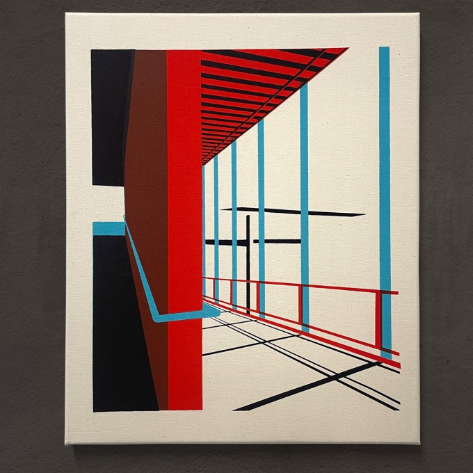 Alle Drucke dieser Serie spielen mit der Formsprache von Bauten der Moderne (ca. 1920-1960), mit linearen Schattenwürfen und starken Farbkontrasten die einerseits die strikte Orthogonalität unterstreichen wie auch gleichzeitig aufbrechen – eine Spannung die sich zumindest für uns so nur in der Architektur dieser Zeit findet.