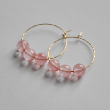 Schlichte und edle Creolen in Weissgold (silbern) oder 14K Gelbgold (golden) platiniert... 3 Perlen aus rosanem Rosenqaurz bilden den Blickfang dieser schicken Ohrringe.