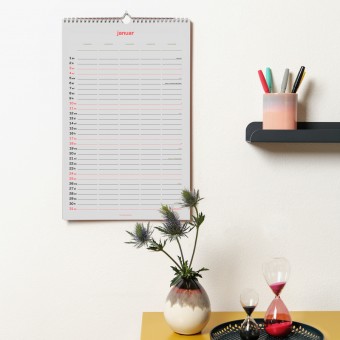 Perfekt neben dem Türrahmen, als Küchenkalender, und überall wo es auf wenig Raum viel Platz für Kalendereinträge geben soll: der rikiki Streifenkalender.